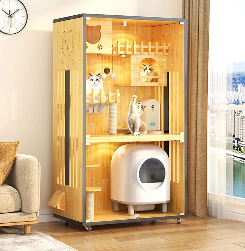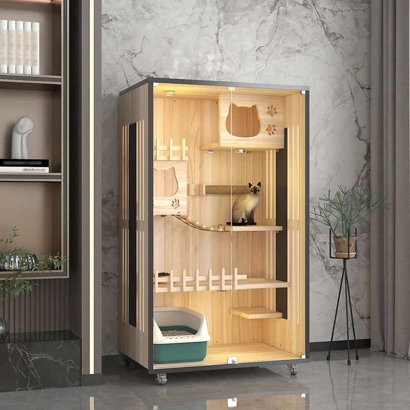 Conception de cadre de s'élever : Les villas de chat viennent avec les cadres intégrés ou reliés de s'élever pour que les chats s'élèvent et pour se déplacent autour. Des cadres de s'élever sont habituellement faits de bois et comporter les plates-formes multiples et les points s'élevants, permettant à des chats de montrer leurs qualifications et curiosité de rampement.